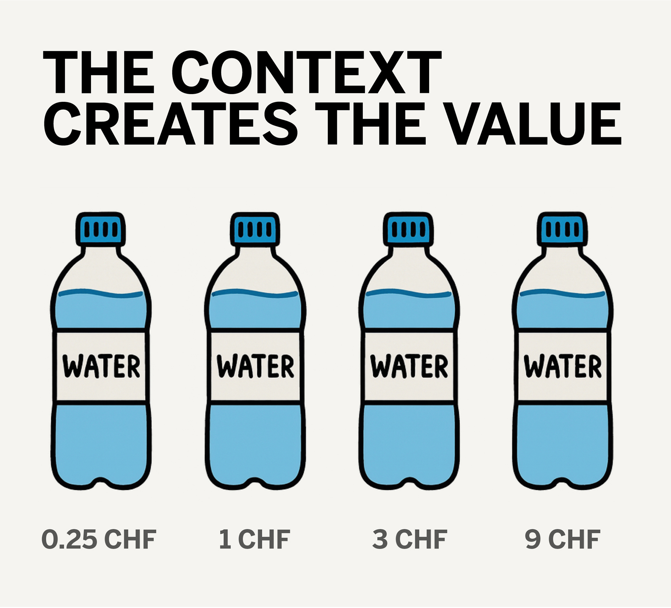 • Evian in der Glasflasche im Zürcher Luxushotel: 0,75 l für 14 CHF – nicht, weil das Wasser „besser“ schmeckt, sondern weil die Marke eine Welt aus Lifestyle, Gesundheit und Luxus erzählt.